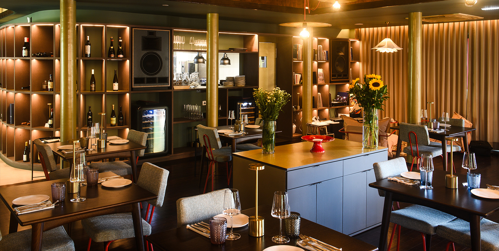 Na nossa zona interior poderão encontrar uma sala com capacidade para 44 pessoas, incorporada com uma biblioteca com uma seleção de vinis, livros e um sistema de som de alta definição, onde podem escolher o som que ocupará a sala. É um espaço que transmite modernidade e funcionalidade. Também existe uma zona infantil preparada para entreter os mais novos com legos e outros brinquedos, enquanto usufrui da música. |